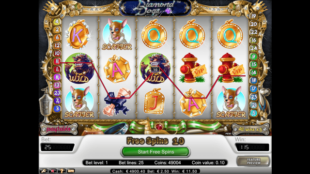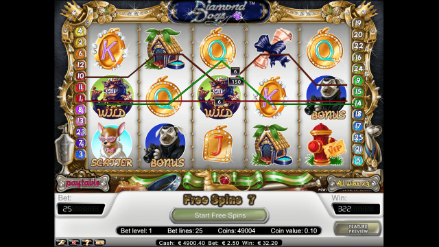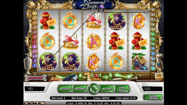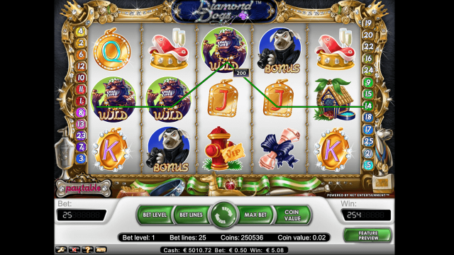На поле появляются 7 базовых пиктограмм, которые формируют призовые последовательности, а также 3 специальных символа. Среди обычных картинок гэмблер увидит игральные карты, иконки с костью, миской с куском мяса, будкой, гидрантом. Цепочки из этих изображений формируются на активных линиях слева направо. Выигрыш за комбинацию вычисляется путем умножения ее коэффициента на линейную ставку. Вайлд представлен в виде изображения черного оскаленного пса. Он заменяет собой другие картинки и формирует самостоятельные цепочки. Иконка с чихуахуа — Скаттер, который не зависит от активных линий. Он приносит выигрыши в случае выпадения на любых позициях поля. Изображение собаки с фотоаппаратом выполняет функции символа Бонус. Он активирует призовой тур.